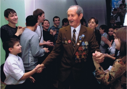 Иван Федотович Огиенко на встрече со школьниками в сопровождении дочери – Ирины Ивановны Голик