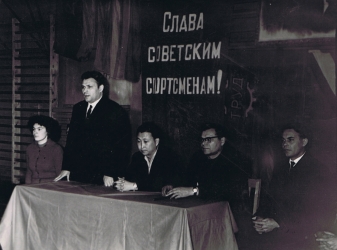 ТКМ 1917 ГИК - Открытие спортзала. За столом слева направо: Г.А. Буйко (Дядюшкина), Шумилов, В.Н. Ли, А.Ф. Колониченко, А. Бажакин. г. Дудинка, 1964 г.