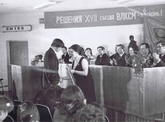 ТКМ 3634 ГИК - Вручение комсомольских билетов в ГК ВЛКСМ. (Комсомольский билет вручает Дядюшкина Г.А.). г. Дудинка, 1975г.