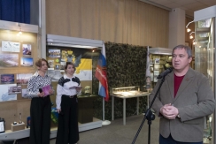 С короткой приветственной речью выступил участник Специальной военной операции, механик-водитель 9 роты 3 батальона 169 отдельной мотострелковой бригады Владимир Евай. В прошлом году Владимир Владимирович передал в фонд Таймырского краеведческого музея свои личные вещи: флаг с подписями бойцов, армейский жетон, нашивки, часы и штык-нож. Все эти предметы были представлены в обновлённой экспозиции «СВОи.Таймыр», презентация которой стала частью мероприятия. Также экспозицию дополнили форменный берет, котелок и флаг Воздушно-десантных войск участника открытия выставки «СВОи.Таймыр» в прошлом году, гвардии рядового 2-го батальона 2-й минометной батареи 1-й отдельной гвардейской десантно-штурмовой бригады ВДВ «Чёрные волки» Дмитрия Подылина.