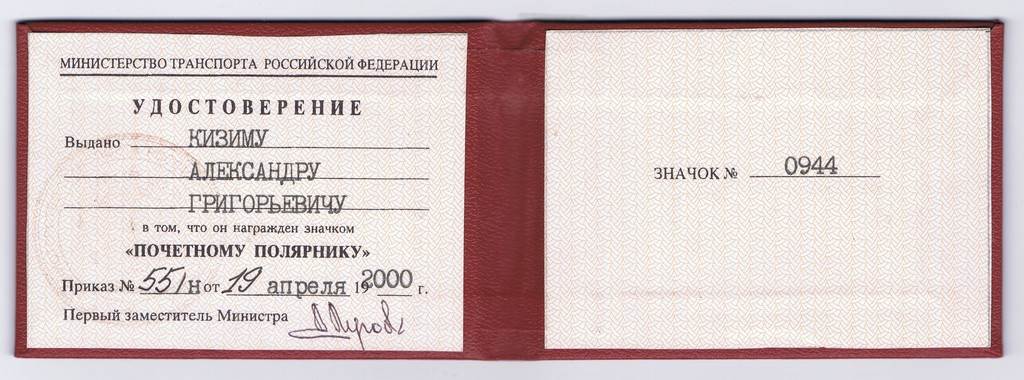 ТКМ ГИК 9780 Удостоверение Кизима А. Г. подтверждающее выдачу значка «Почетный полярник»