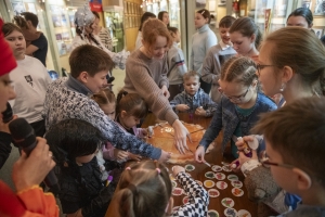 Во время интерактивного шоу дети, их папы и мамы вместе с Вовкой путешествовали по музейным локациям и выполняли задания героев русских сказок. Определяли на карте места обитания животных, искали потерявшихся в тундре оленей, строили дом для Старухи с разбитым корытом, своими руками изготавливали ковер-самолет, занимались зарядкой с Близнецами из ларца и даже помогли Печке-матушке испечь пирог! Не обошлось без хоровода у Новогодней елки и игр со Снегурочкой и Дедом Морозом!