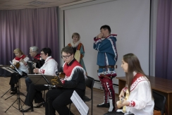 Завершилось мероприятие музыкальным выступлением ансамбля преподавателей Детской школа искусств им. Б.Н. Молчанова «Енисейские напевы», под руководством Ольги Аксенович, совместно с Семёном Яптунэ и Ольгой Глуховой. Ведь музыка - это тоже язык. На нём можно рассказать обо всём: о бескрайних снегах, о тоске по дому, о радости встречи и о любви к своей земле.