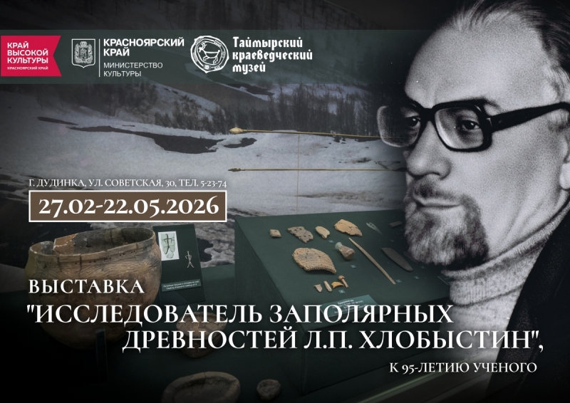С 27 февраля по 22 мая в Таймырском краеведческом музее будет работать выставка «Исследователь заполярных древностей Л.П. Хлобыстин», посвященная 95-летию со дня рождения советского археолога, доктора исторических наук Леонида Павловича Хлобыстина.