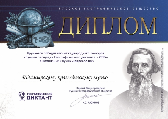 Музей получил Диплом победителя Международного конкурса «Лучшая площадка Географического диктанта – 2025» в номинации «Лучший видеоролик»!
